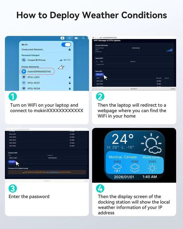 This USB C docking station dual monitor supports up to three independent 4K@60Hz monitors, delivering crisp, lag-free images - ideal for creative work, programming, trading and multitasking. -, ^^ Smart Weather DisplayNo more fumbling for your phone or switching between laptop tabs to check the forecast when you're rushing out the door. It comes with built-in WiFi connectivity and a LCD screen, which automatically syncs real-time local weather when it connects to your network. A quick glance at the screen before you leave tells you exactly what to wear, if you need an umbrella keeping your routine smooth ^^ Visual Intelligence - Smart LCD ScreenStop guessing! This 3 HDMI docking station integrated vivid LCD display provides real-time monitoring of your workstation status.