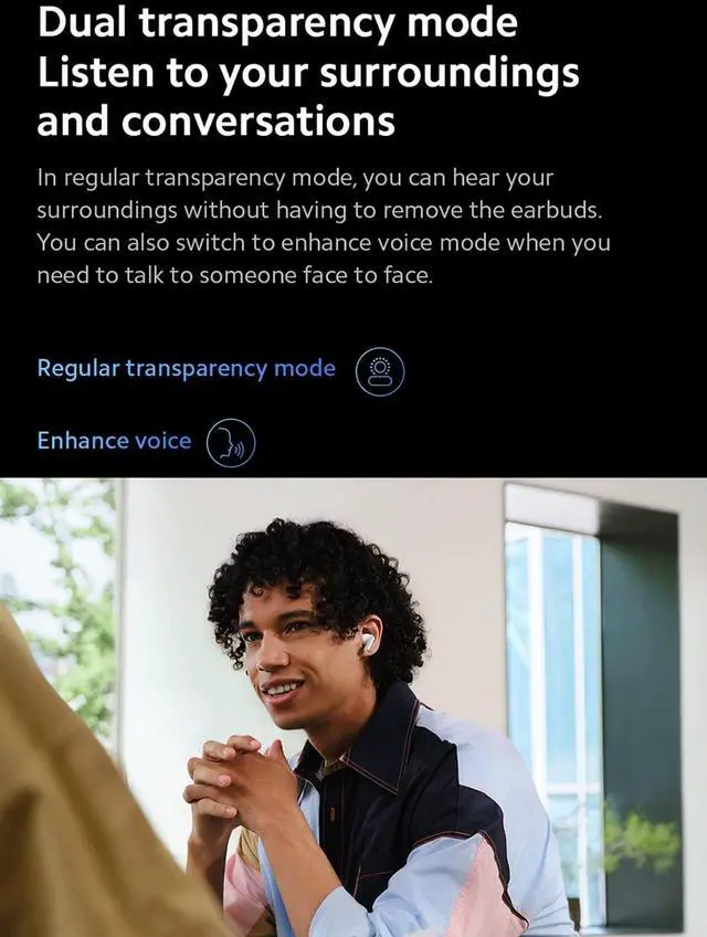 Cutting-edge Noise Cancellation Technology: Up to 43dB active noise cancellation - Effectively reduce unwanted noise. The earbuds can reduce noise by up to 43dB, blocking up to 99.3 % of external noise*, allowing you to enjoy your music in peace and quiet. AI adaptive ANC - Intelligently switches between 3 ANC levels(Light/Balanced/Deep noise cancellation). ^^ Dual Transparency Mode - Listen to your surroundings and conversations: In regular transparency mode, you can hear your surroundings without having to remove the earbuds. You can also switch to enhance voice mode when you need to talk to someone face to face. ^^ Innovative Wind Noise Reduction Technology - Run to your heart's content and leave the wind behind you: Each earbud features a built-in metal wind shield to effectively reduce wind noise, as well as a proprietary wind noise reduction algorithm that automatically switches on when the wind reaches a certain speed so that you can enjoy your outdoor activities without being disturbed. ^^ 3-microphone Noise Cancellation for Calls - Crystal-clear call quality, wherever