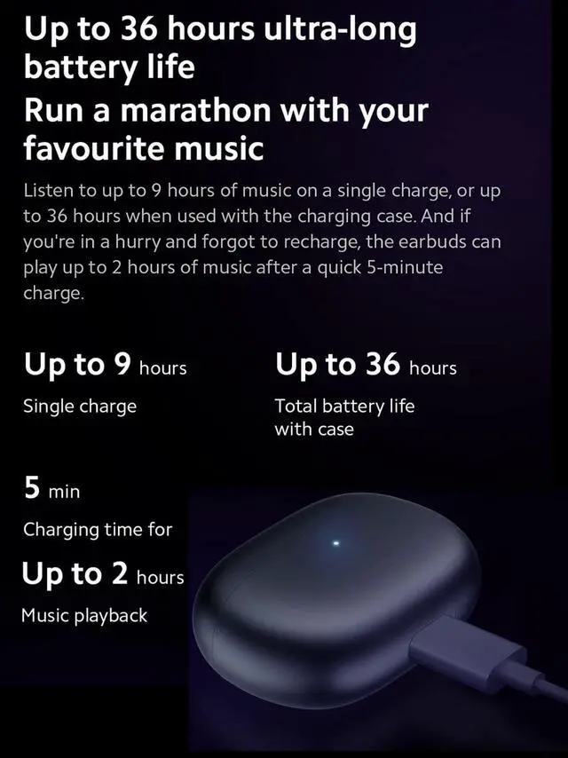 you are: Each of the three microphones has its own function and extracts voice sounds with precision to effectively filter out external noise. Call quality is further enhanced by means of a neural network noise reduction algorithm. ^^ Up to 36 Hours Ultra-long Battery Life - Run a marathon with your favourite music: Listen to up to 9 hours of music on a single charge, or up to 36 hours when used with the charging case. And if you're in a hurry and forgot to recharge, the earbuds can play up to 2 hours of music after a quick 5-minute charge. ^^ Dual Device Smart Connectivity - Switch effortlessly between your smartphone and computer: The earbuds can connect to two Android, iOS or Windows devices at the same time, allowing you to use the same headset when you're in the office. On compatible MIUI devices, the MIUI Pop-up for Quick Pairing requests automatically appear when you open the charging case (with earbuds) near your phone. *