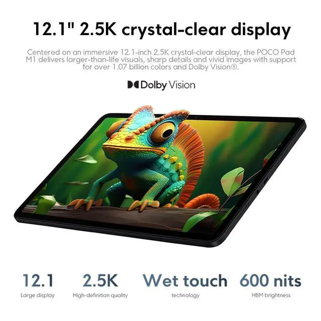 Poco Pad M1 Play to the max 12.1" 120Hz 2.5K displayTUV Rheinland certified eye-care displayMassive 12000mAh (typ) batterySnapdragon 7s Gen 4 Mobile PlatformUp to 2TB of expandable storageQuad speakers for immersive stereo soundDolby Atmos speakers with 300% volume boost5Flagship visual display designed for entertainment 12.1" 2.5K crystal-clear display1Centered on an immersive 12.1 -inch 2.5K crystal-clear display, the POCO Pad M1 delivers larger-than-life visuals, sharp details and vivid images with support for over 1.07 billion colors and Dolby Vision. POCO Pad M1 screen size is about 12.1 inches when measured diagonally. Viewable area is smaller due to the curved corners.