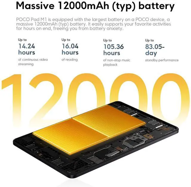 Measurements between individual products may vary. Smooth visuals with up to 120Hz refresh ratePOCO Pad M1 is equipped with a 120Hz adaptive refresh rate display, delivering an exceptionally smooth and responsive visual experience. Whether you're browsing or gaming, it ensures snappy transitions and minimized motion blur, making every interaction more enjoyableQuad speakers for immersive stereo soundPOCO Pad M1 supports Dolby Atmos, providing an immersive audio experience for movies, games, and music. lts four speakers deliver powerful sound with a maximum volume boosted up to 300%. 8POCO Pad M1 is equipped with the largest battery on a POCO device, a massive 12000mAh (typ) battery.