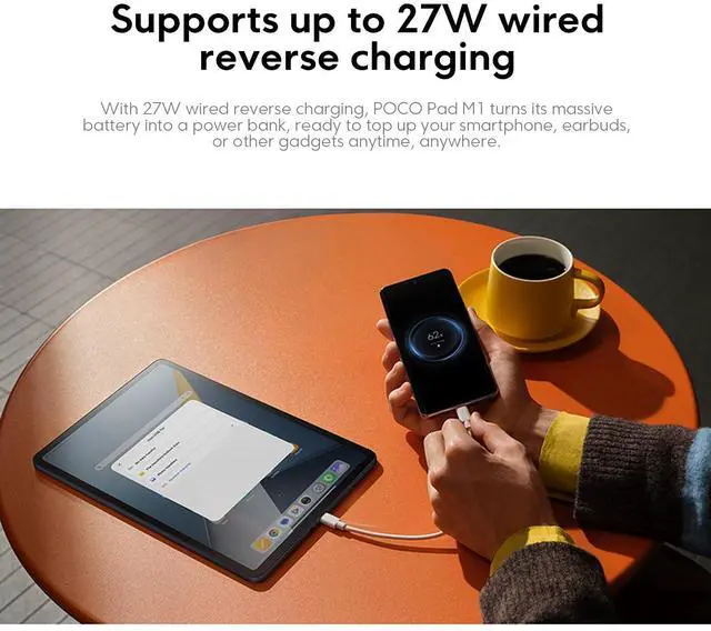 lt easily supports your favorite activities for hours on end, freeing you from battery anxiety. 9Supports up to 27W wired reverse charging6With 27W wired reverse charging, POCO Pad M1 turns its massive battery into a power bank, ready to top up your smartphone, earbuds, or other gadgets anytime, anywhere. 3