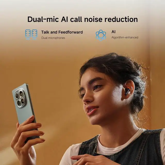 CLEAR CALLS WITH AI DUAL-MIC ENC: Stay heard clearly even in noisy environments. Equipped with dual microphones and AI-powered environmental noise cancellation (ENC), the earbuds effectively filter out background chatter and wind noise (up to 6m/s), ensuring your voice is transmitted crisply during phone calls.