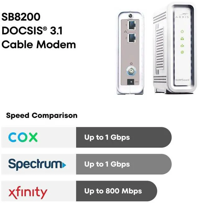 The SURFboard SB8200 is compatible with major U. S. cable internet providers including Cox, Spectrum, Xfinity and others. It's approved for cable internet speed plans up to 1 Gbps. Check your cable ISP website to confirm compatibility.