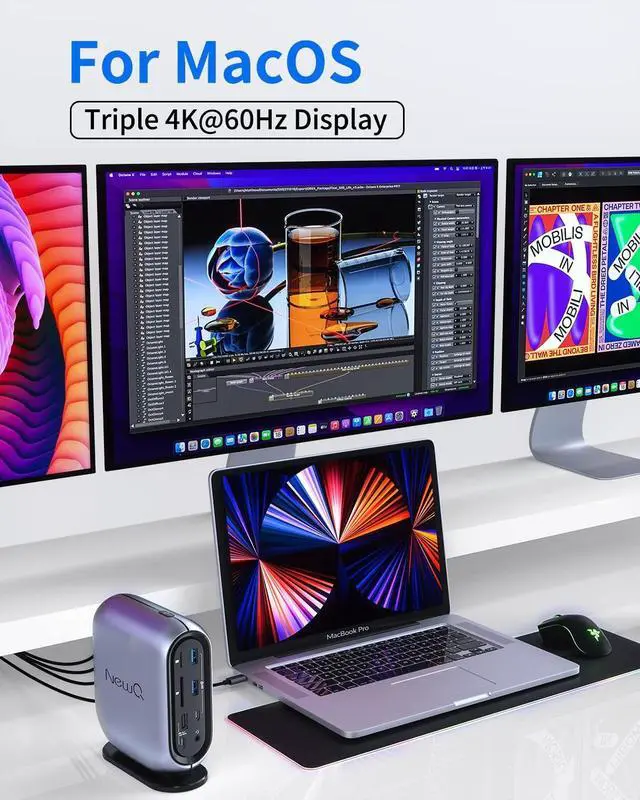 Unlock Triple 4K Display for M-Series MacsDrive three external monitors in stunning 4K@60Hz resolution (2x HDMI + 1x DP) with advanced DisplayLink technology. This is the ultimate triple display docking station for Mac users, specifically designed to bypass the native single-display limit of base M1, M2, and M3 MacBooks. Perfect for coders, designers, and traders who need massive screen real estate. (Requires driver installation for macOS/Windows). ^^ 16-in-1 SuperSpeed Connectivity HubExpand your workspace with 16 versatile ports: 3x USB 3.2 (10Gbps), 2x USB 2.0, Gigabit Ethernet, SD/TF card readers, and dual 3.5 mm audio jacks (in/out). This DisplayLink USB-C docking station consolidates all your drives, peripherals, and accessories into a single, clutter-free connection. ^^ 150W All-in-One Power Delivery & Fast ChargingThe included 150W power adapter delivers a full 100W PD to fast-charge your MacBook Pro 16" or other laptops, while two independent 18W PD ports (Type-C + Type-A) quickly power up your phone and tablet. This docking station eliminates the need for multiple chargers on your desk. ^^ Advanced Cooling for 24/7 ReliabilityEngineered for marathon work sessions, the full aerospace-grade aluminum body dissipates heat three times faster than plastic docks. Combined with intelligent thermal management and large internal space, it ensures stable performance and prevents overheating, even under continuous triple-display load. ^^ Universal Compatibility & Easy SetupThis universal USB-C hub uses the DisplayLink protocol, making it compatible with Thunderbolt-equipped Macs (for data). Works with macOS 10.12 +, Windows 7+, and Chrome OS. Our simplified guide makes driver setup a breeze.