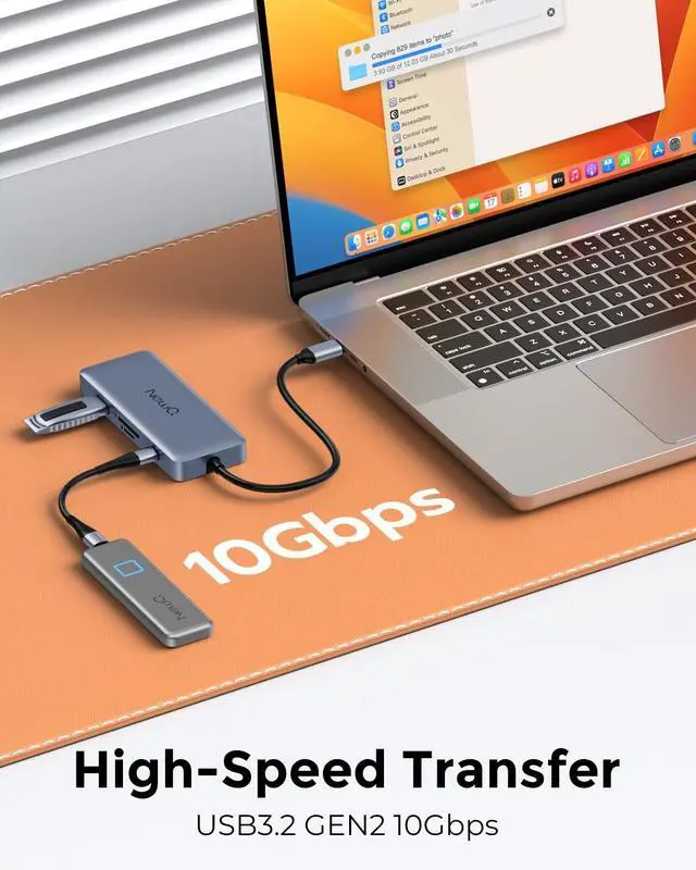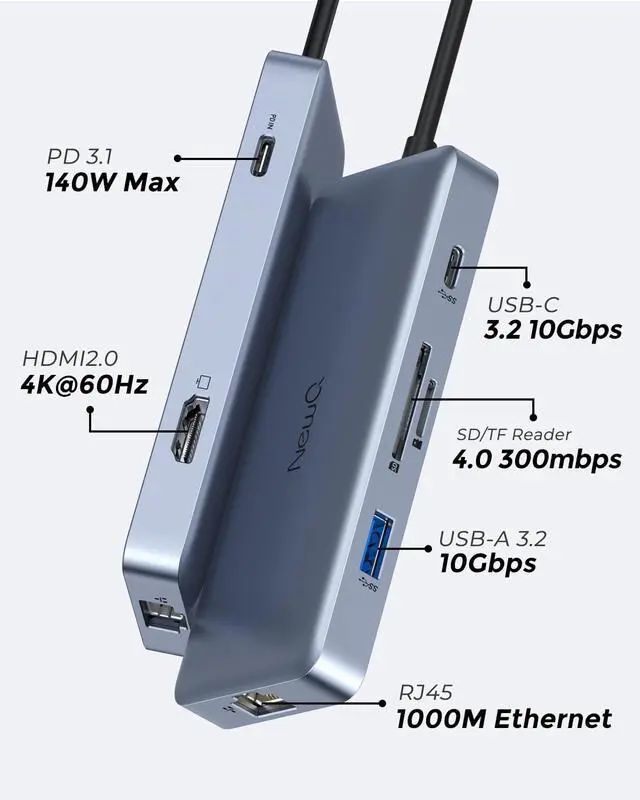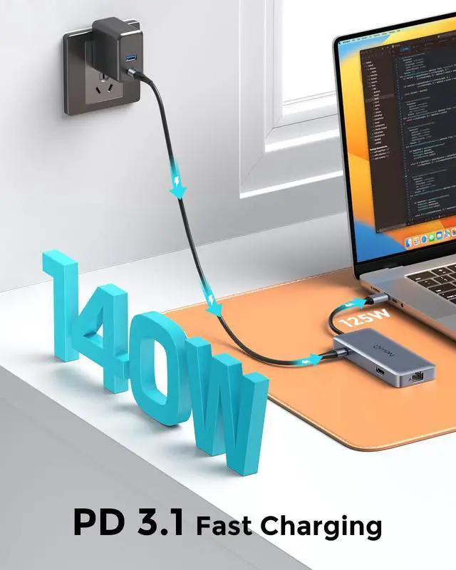 Powerful 140W PD 3.1 Fast ChargingCharge your laptop or devices with up to 125W output through this USB-C hub with power delivery. Keep working, gaming, or streaming without worrying about battery life, thanks to the USB-C dock or Thunderbolt multiport adapter. ^^ 10Gbps High-Speed Data TransferEnjoy lightning-fast file transfers with USB-C and USB-A ports, both supporting USB 3.2 Gen2, and making your workflow more efficient. The USB 4.0 hub and USB C Thunderbolt hub offer a seamless experience for transferring large files in seconds. ^^ 4K@60Hz Ultra HD DisplayConnect to external monitors with the Thunderbolt 4 hub or USB C hub with HDMI 4K 60Hz for stunning resolution, perfect for your work, entertainment, or creative projects.