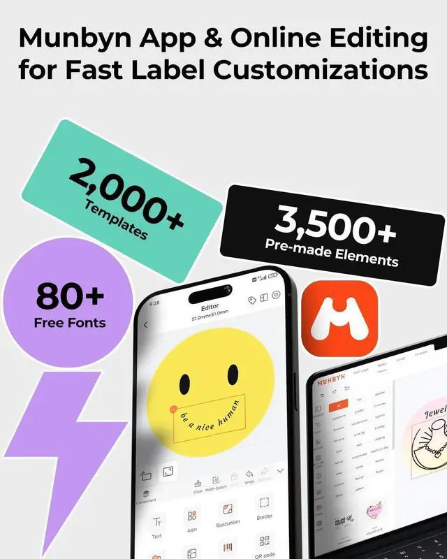 Customize labels for any occasion: With MUNBYN thermal label printer, access 3,500+ elements, 2,000+ templates, and 80+ fonts. Import PDFs/TXTs or use OCR for text recognition. Enjoy multi-language support across platforms. Download 'MUNBYN Print' for mobile and tablet