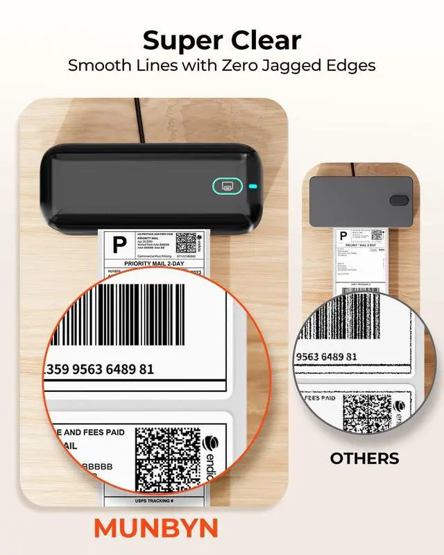 Long-Term Costs: The Munbyn RW402B thermal shipping label printer helps you smartly reduce long-term expenses. With MicroJam Technology, jams occur less than 0.01 % of the time, boosting productivity and decreasing waste from error printing. This technology ensures consistent printing, so your multitasking encounters fewer unexpected interruptions