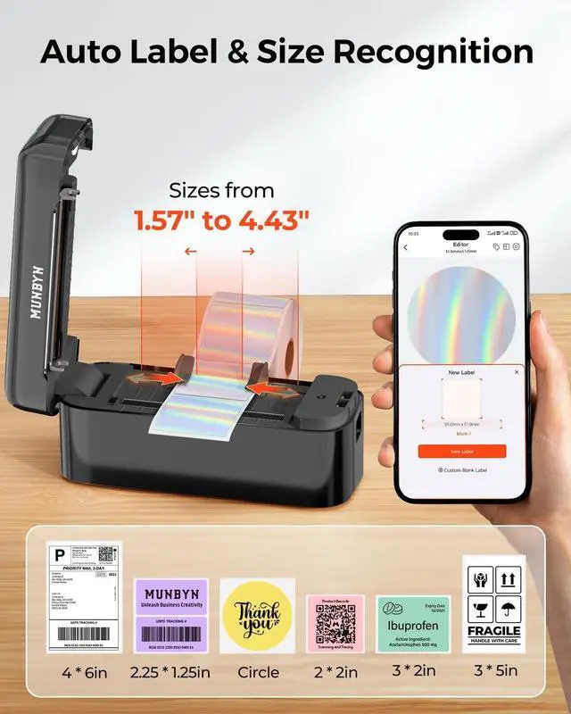 Maintain: The Munbyn RW402B thermal label printer is built to last, capable of printing up to 970, 000 shipping labels in its Lifespansix times more than ordinary machines. Its app features Auto Size Detection, automatically recognizing label sizes from 1.57" to 4.3", saving you the hassle of manually sorting through label stacks to find the right oneTransparent labels may be incompatible) ^^ Make Your Printing Tasks a