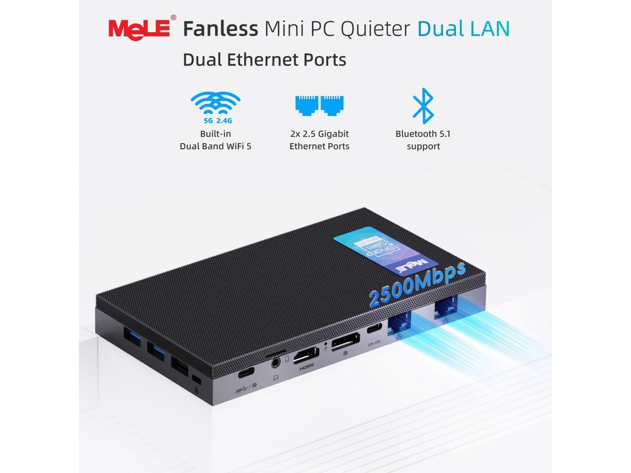 MeLE QuieterDL Fanless Mini PC 2.5Gb Dual LAN N100(up to 3.4GHz) 8GB RAM 256GB Storage Micro PC Small Form Factor PC USB-C HDMI2.0+DP1.4 Triple Display Desktop Computers for Astrophotography