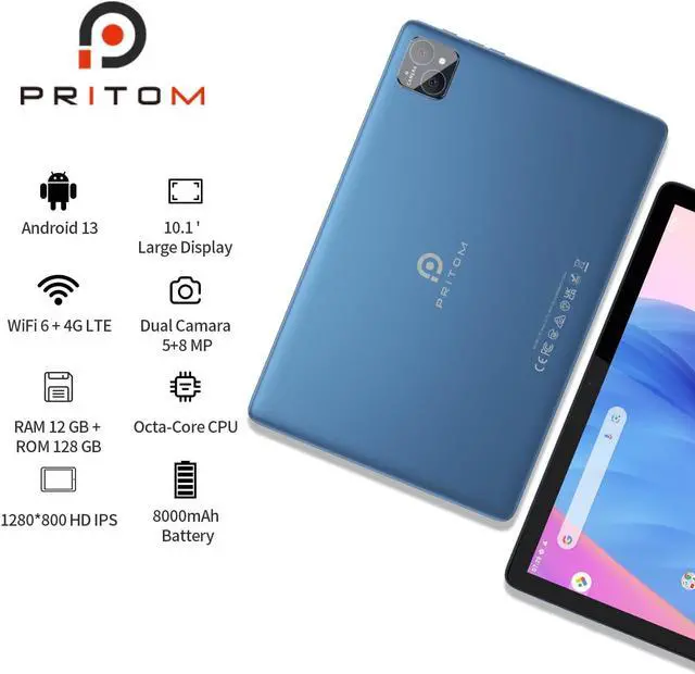 [ HIGH PERFORMANCE ANDROID 13 TABLET ] - Pritom TAB 12 Phone Tablet android features the lastest android 13 OS, 12GB RAM(6GB Virtual extended) and the more powerful and energy-saving 2.0 GHz Octa-core 64Bit Processor, make this tablet at a higher level and better overall performance. TAB 12 tablet comes with a large storage of 128 GB, so you don't need to worry about the memory to store more important things.Tips, The TAB 12 tablet comes with a durable protective case