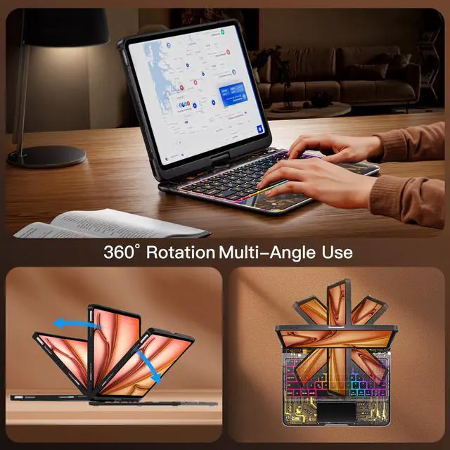7-Color Backlighting: The keyboard has built-in seven-color lighting under the keyboard, three brightness adjustments so that you can clearly see every key text day and night. Close/open the tablet, the keyboard and tablet will automatically sleep/open.