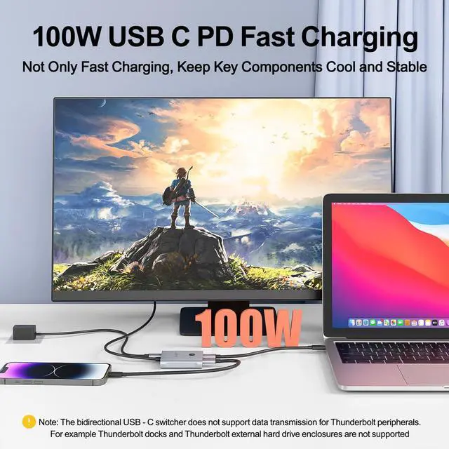 [(100W Fast Charging & 10Gbps Data Transmission)] USB Type C switches supports a maximum transfer speed of 10Gbps (USB3.1 Gen2) to transfer music, movies or an entire season of TV shows in seconds. Also it can be charged while working, compatible with fast charging up to 100W. Note: The monitor, data cable and device you use should support fast charging, and the monitor needs to support reverse charging.