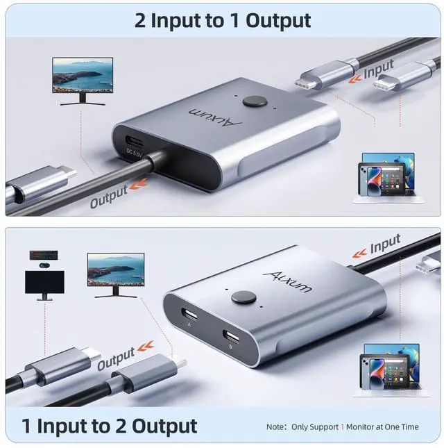 Alxum Bi-Directional USB C Switch - 2 in 1 Out/1 in 2 Out 2 Computers Share 1 Monitor,KVM Switches Support 8K@60Hz Video 10Gbps Data Transfer, USB-C Cables Included