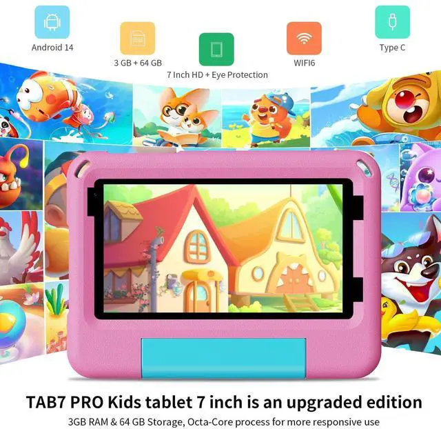 • PRITOM TAB7 PRO Kids Tablets 7 inch, 64 GB, 3 GB RAM Upgraded, Toddler Tablet Android 14 with WiFi, Dual Camera, Education, Games, Kids Software Pre-Installed, Parental Control, Pink