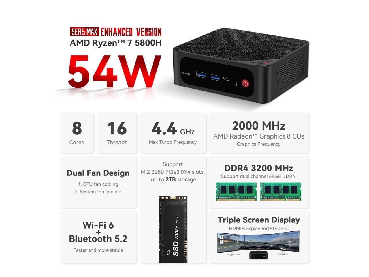 - [(AMD Ryzen 7 5800H Processor)] Beelink SER5 MAX 5800H is equipped AMD Ryzen 7 5800H(8 Cores 16 Threads, max turbo to 4.4 GHz,),which creates a very smooth experience for your visually home entertainment, streaming video, Web browsing, work, and games.