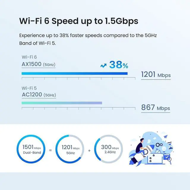 Dual-Band Wi-Fi 6 Mesh AX1500 -- Enjoy smoother and more stable streaming, gaming, downloading and more with Wi-Fi speeds up to 1.5 Gbps (1201 Mbps on 5 GHz band and 300 Mbps on 2.4 GHz band)