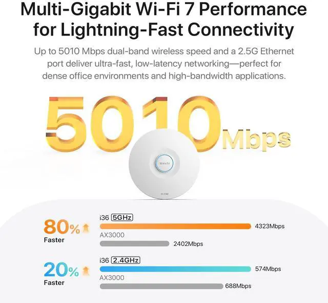 Tenda i36 Wi-Fi 7 Ceiling Mount Access Point, Dual-Band BE5010, Up to 5010 Mbps, 2.5G PoE+ Port, MU-MIMO, Seamless Roaming, Cloud Management, WPA3 Security, VLAN, Ideal for Business & Office