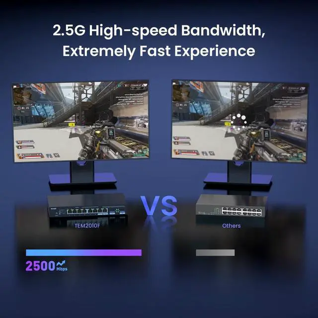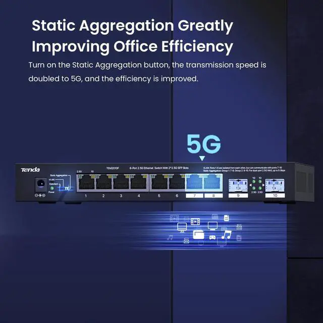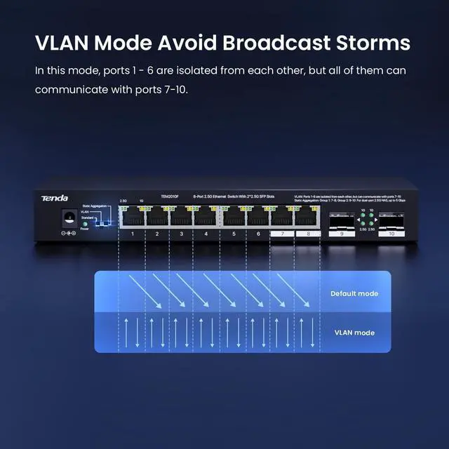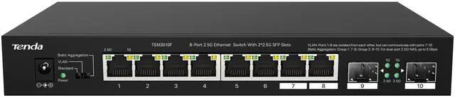 : Add to Cart Now & Lock Your July Deal! This excellent switch will bring you a huge surprise! ^^ PLUG AND PLAYEnjoy quick and easy setup with no configuration or software required, TEM2010F is your perfect 8 port 2.5G bps switch choice ^^ THREE-MODE TOGGLETenda Unmanaged 8 Port 2.5G Ethernet Switch support three modes of Standard, VLAN and Static Aggregation, flexible for 2.5G WiFi 6 AP, 2.5G & 5G NAS, 2.5G PCIe Adapter, 2.5G Server, Gaming Computer, 4K Video, LAN Party or SOHO PRO Users, etc ^^ 50G SWITCHING CAPACITYTEM2010F switch is 2.5 times faster than Gigabit switch, provides 50Gbps switching capacity, higher and faster configuration to speed up the transmission of large files and improve transmission efficiency ^^ RELIABLE AND QUIETEthernet switch 2.5 Gigabit with IEEE 802.3X flow control provides reliable data transfer; fanless and metal design ensures quiet operation and better heat dissipation