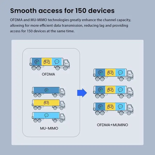 ^^: OFDMA and MU-MIMO technologies greatly enhance the channel capacity, allowing for more efficient data transmission, reducing lag and providing access for 150 devices at the same time.