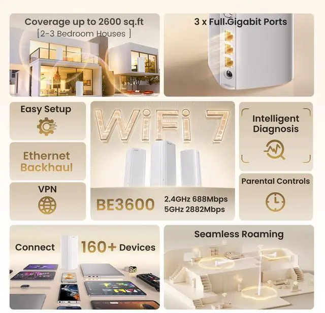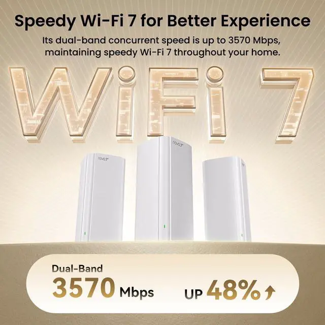 - - - -Equipped with cutting-edge Wi-Fi 7, the ME3 PRO leverages advanced tech like MLO and 4K-QAM to deliver blazing dual-band speeds up to 3.6 Gbps. Thats 2882 Mbps on 5GHz + 688 Mbps on 2.4GH znearly 48% faster than standard Wi-Fi 6 ^^ -No Dead Zones, Even in Large Spaces Advanced Mesh tech delivers seamless coverage across 2, 500 sq. ft., eliminating dead zones. Supports 160+ devices at once without slowing downideal for big homes or busy households ^^ - -Each node has 5 high-gain antennas + 5 high-power FEMs for extended range and steady signals.