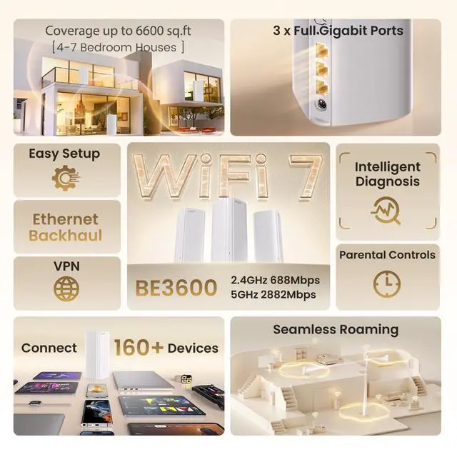 Ideal for homes with many connected devices, it delivers balanced performance where coverage matters most ^^ -Set up and manage your mesh wifi system easily through an intuitive app. Guided installation helps beginners get online quickly, while advanced options are available for users who want more control over their wireless mesh network ^^, - - - Built for long-term use, this wifi mesh 7 system supports the new WiFi 7 standard while remaining compatible with existing devices. Performance benefits are most noticeable with supported devices and suitable network conditions, making this a practical, future-ready wireless mesh wifi system
