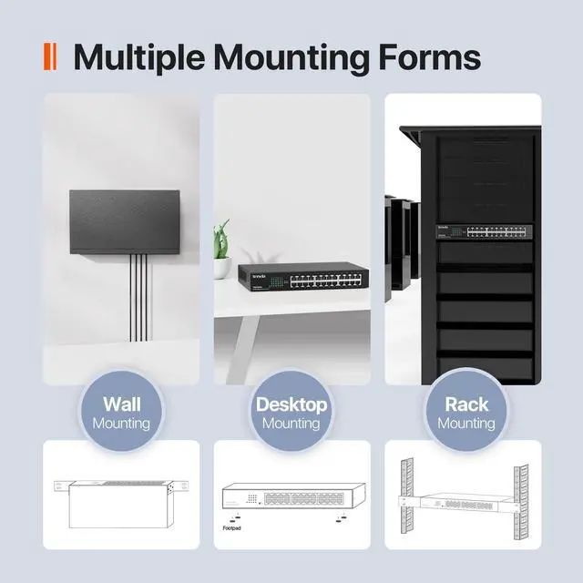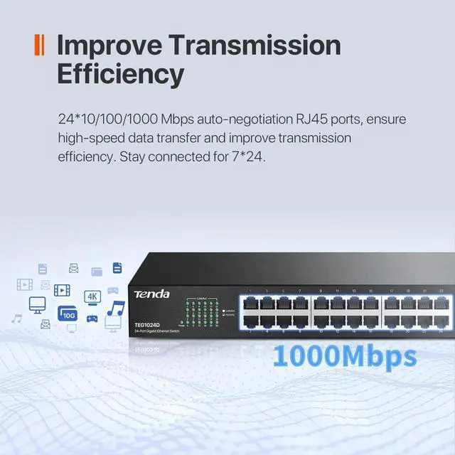 : Add to Cart Now & Lock Your July Deal! This excellent switch will bring you a huge surprise! ^^ Gigabit switch equipped with 24 10/ 100/ 1000Mbps Auto-negotiating MDIX RJ45 Ethernet ports. Add more Gigabit Ehternet ports to your Mesh System, Routers, etc ^^ 24 port switch provide 4M Buffer, 48Gbps Switch Capacity and support 12K Jumbo Frame to speed up the transmission of large files and improve transmission efficiency ^^ Network switch 24 port with IEEE 802.3X flow control provides reliable data transfer; fanless and metal design ensures quiet operation and better heat dissipation ^^ Full steel housing and plating through holes in three faces allow higher-efficient heat dissipation; fanless design ensures the noiselessness and dust free, harmoniously fitting into the office
