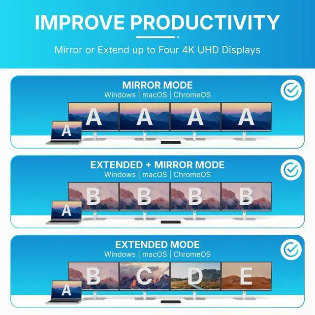 ^^ Universal Compatibility: Works with Windows, macOS & ChromeOS laptops via USB-C, Thunderbolt 5/4/3 or USB-A. Powered by DisplayLink for reliable cross-platform performance.