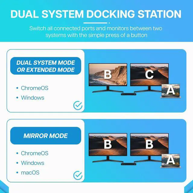 The VT2900 Dual System KVM Universal Dock allows you to switch all connected ports and monitors between two systems with the simple press of a button. Balancing professional tasks with personal work can get tedious when switching your peripherals back and forth between work laptops and your home system. This high-quality dock is a single-cable solution that enables you to easily connect and switch displays and peripherals between 2 systems. Take full advantage of up to two additional 4K displays, 3 USB-A devices, 2 USB-C devices including full sized keyboard and mouse, external storage and mobile devices for charging and data transfer as well as up to 100W of Power Delivery.