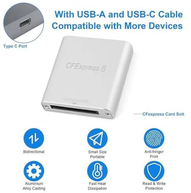 Product use: suitable for the extension of the CFexpress card to the USB3.0 or USB3.1 slot.(not work for XQD/CFA card),The CFexpress memory card USB 3.1 Gen 2 is compatible with a variety of platforms, including Windows, Mac, and Linux, and can be used for PC, desktop, Mac and iPad to facilitate data transfer. It also supports type C connectors for easier plugging and unplugging.