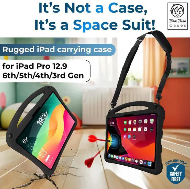 Bam Bino Space Suit Kids Case for iPad Pro 12.9" 3rd/4th/5th/6th Generation (2018-2022) Models [Not for iPad Pro 12.9 1st/2nd Gen] Screen Guard, Handle, Shoulder Strap, Pencil Holder (Cosmic Black)
