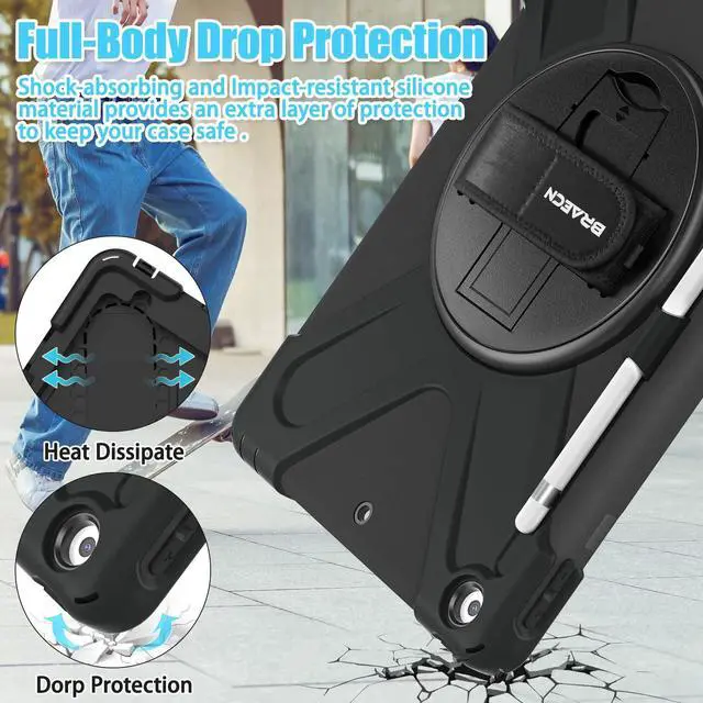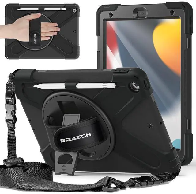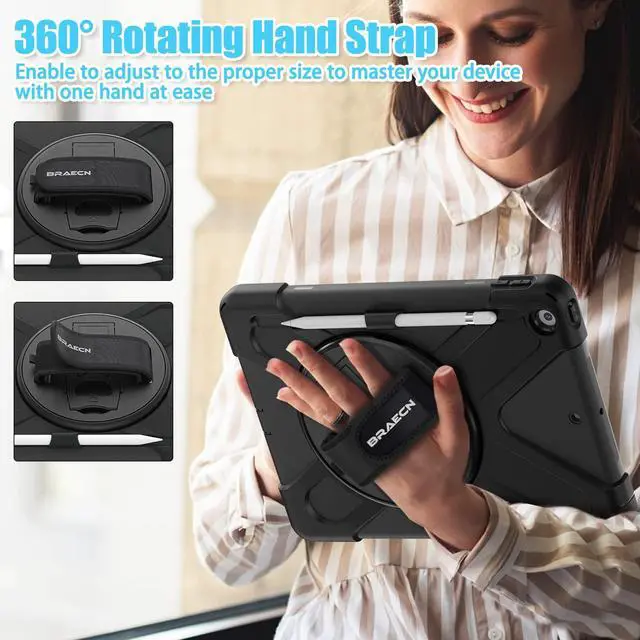 BRAECNstock Case for Apple iPad 9th/ 8th/ 7th Generation 10.2" 2021/2020/2019, Shockproof Protective iPad 10.2 inch Case Kids with Screen Protector, Pencil Holder, Rotating Hand Strap & Stand, Black