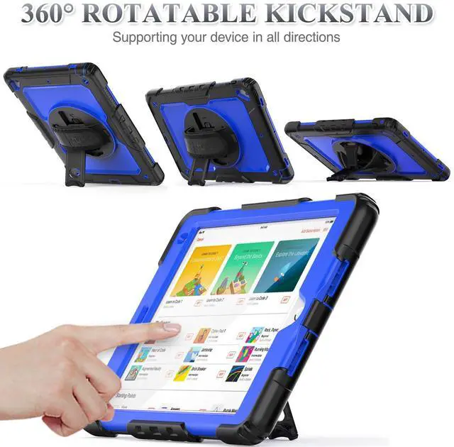 SEYMAC stock Case for iPad 6th / 5th Generation Case/Air 2 / Pro 9.7 inch, Heavy Duty Protective with Screen Protector, with Pencil Holder, Hand Strap, Shoulder Strap, 360 Rotate Stand, Blue+Black