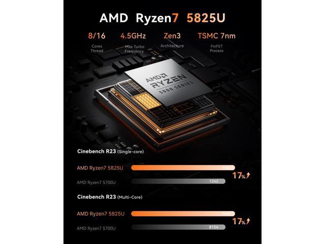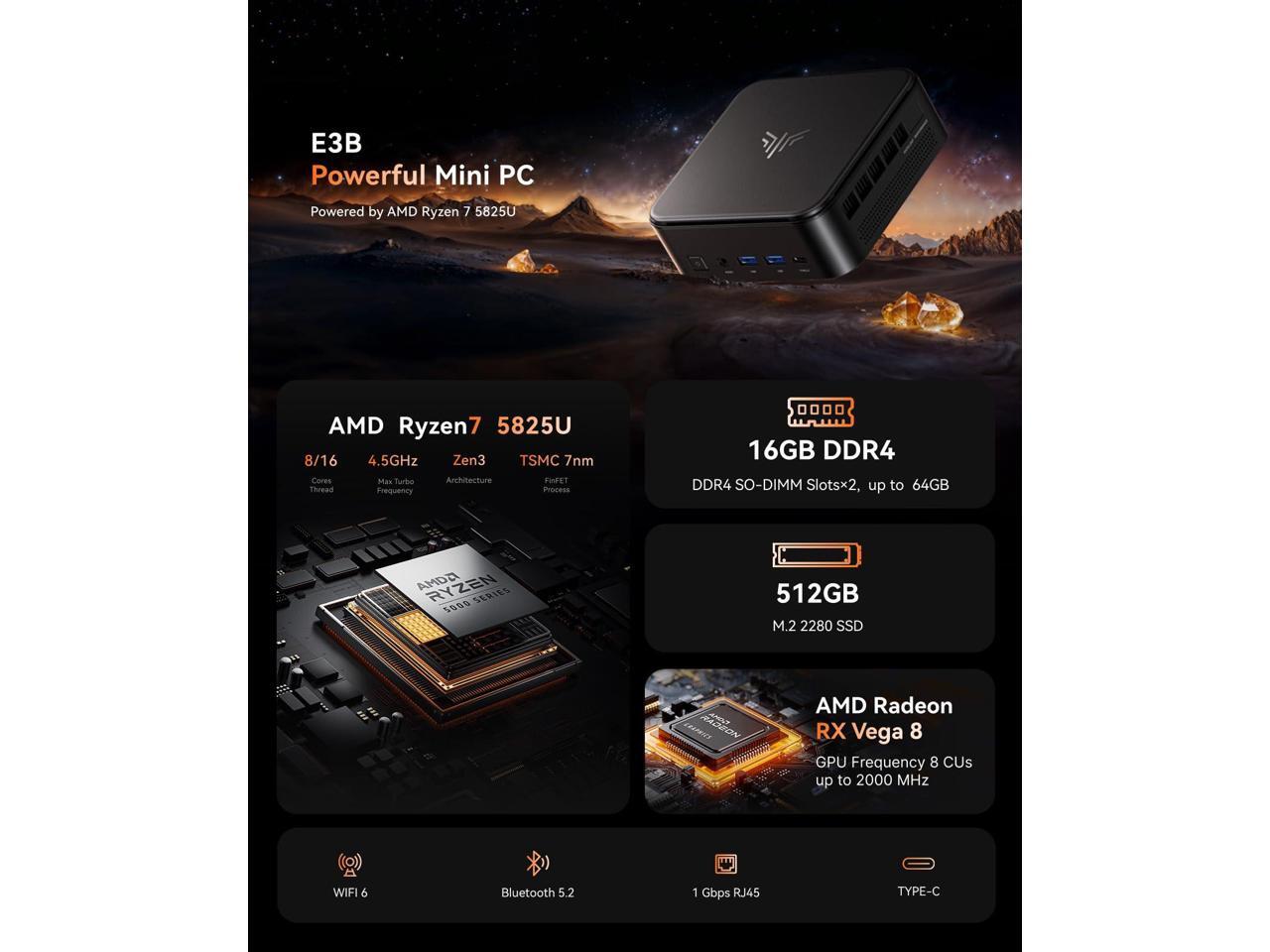 Powerful Mini Computer: KAMRUI E3B Mini PC with AMD Ryzen 7 5825U (8 cores, 16 threads), Zen 3 architecture, 15W TDP, up to 28W, base clock frequency of 2 GHz, up to 4.5GHz. Its single-thread performance is 25% higher than the R7 5700U, which enhances the smoothness of everyday tasks that rely on single-thread performance, such as web browsing, document editing, and email management