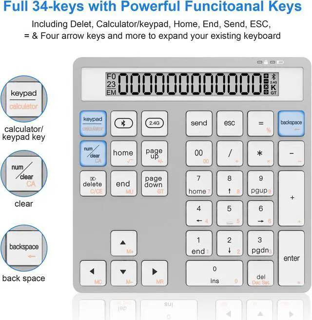 Multi-function 34-Key Keypad: With NumLock, ESC, Delete, pgup, pgdn, insert,00 and a keypad/calculator key which can switch calculator and keypad mode directly etc. The numeric keypad is equipped with calculator function, perfect for financial accountants, students, office specialists, and spreadsheet experts.