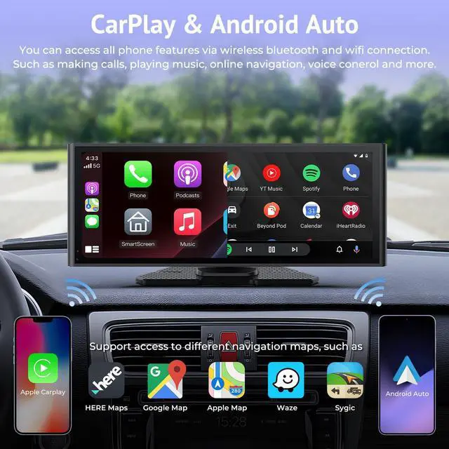 [(Seamless Driving)] Enjoy effortless driving with the carplay screen for car with bluetooth that wirelessly connects to both CarPlay and Android Auto . Stay focused while accessing GPS, music, calls, and messages--all through a crisp 10.26 inch display. Say goodbye to messy cables and hello to wireless Bluetooth and WiFi connectivity. Whether you're an iPhone or Android user, enjoy a smarter, safer, hands-free ride every time.Compatible with IOS 6 and above, Android 11 and above