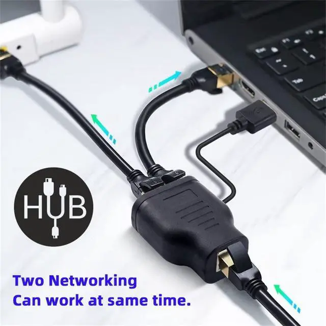 The two networking can work at same time. and you need to connect the usb power. 100Mbps STP UTP RJ45 8P8C Plug To Dual RJ45 HUB Splitter Network Ethernet Switcher Adapter ^^ This compact splitter is the perfect tool for expanding your home or office network, allowing more than one computer to be connected to the same ports! ^^ Easily convert your RJ45 outlet to two RJ45 sockets with this network splitter ^^ This compact design allows you to comfortably increase the number of RJ45 network connections on an RJ45 outlet. Allow two computers to share high speed DSL, cable modem and Ethernet ports.