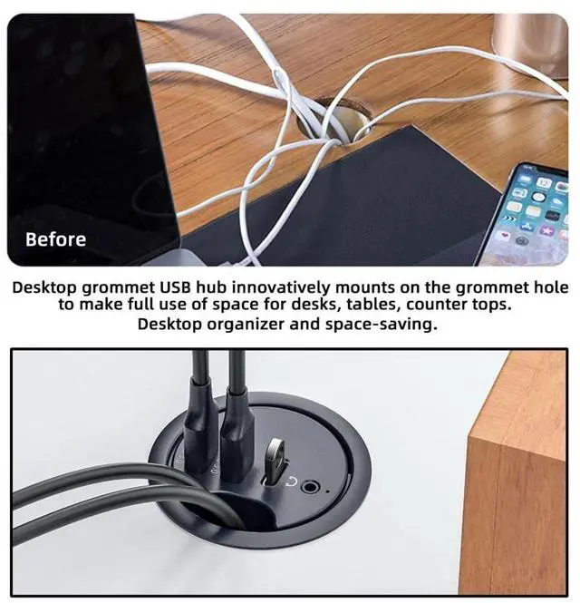 [Fits 2.36" Standard Grommet Hole] Only fit for 2.36" /60mm standard grommet hole, please make sure your desk hole diameter is 2.36" before purchasing. ^^ [Desk Grommet USB Hub] Designed for an easy access to the ports of a PC on your desktop. You can mount the usb hub on the grommet hole, to make full use of space for desks. ^^ [Tool-free Installation] Plug and play and support hot plugging. In addition, the LED light can easily show its working status. Simple and easy to use, just follow the operation steps to put the hub into the table hole.