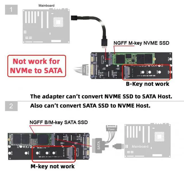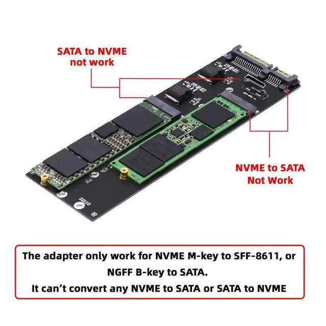 Oculink SFF-8612 8611 to U. 2 Kit M-Key to NVME PCIe SSD and NGFF to SATA Adapter for Mainboard Oculink 4x connectors are internal and external small form factor PCI-E connectors and cables optimized for the client and market. ^^ Supports M. 2 modules in format 2280, 2260, 2242 and 2230 with key B or key B+M based on SATA The card can not work for NVME M-key SSD to SATA host, it can't work for NGFF B-key SD to oculink host either. ^^ It can only work for NVME M-key SSD to oculink or NGFF B-key SD to SATA.