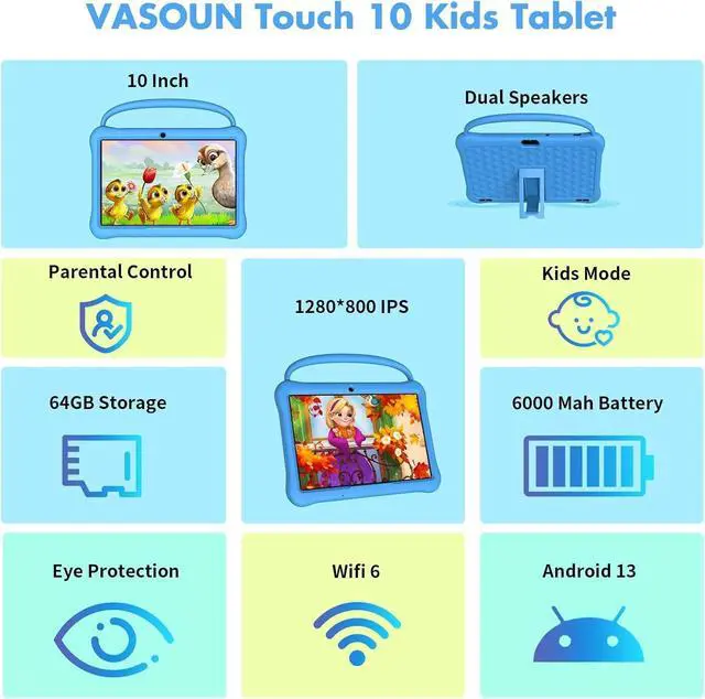 Fully Functional & Kid FriendlyThe kids tablet is equipped with a long-lasting 5000mAh battery, 2MP+8MP dual cameras, 2GB RAM+ 64GB ROM storage space, 2.4G WiFi & Bluetooth, and supports 38 languages including English / Spanish, ect. The 10-inch 1280 x 800 IPS HD display screen brings bright and vivid graphics for a better learning and use experience for kids.