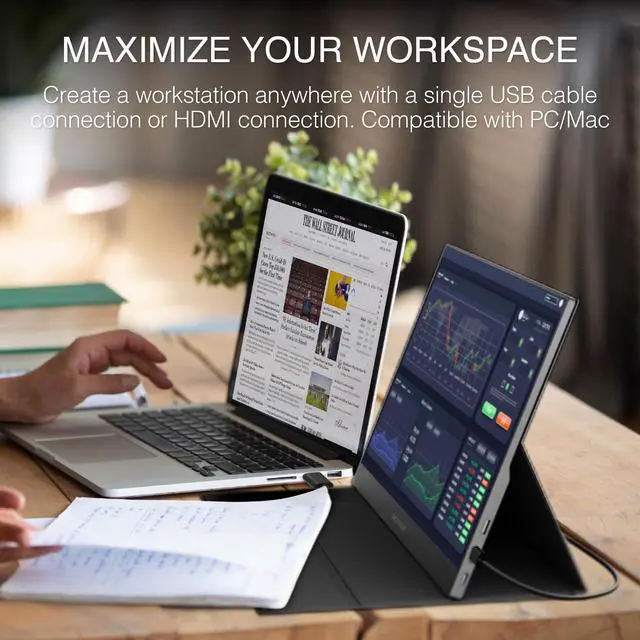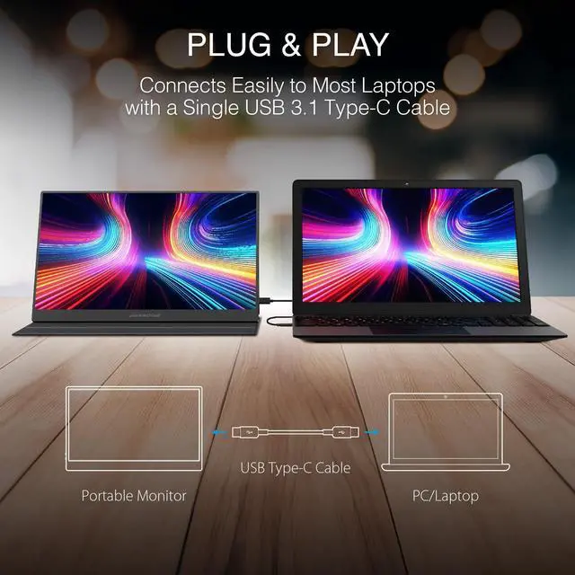 Elevate your viewing experience with the Packard Bell 15.6" Portable FHD Monitor. Featuring a stunning 1080P resolution and ultra-slim design, this monitor is perfect for on-the-go professionals and students alike. The vibrant IPS display ensures crystal-clear visuals and wide viewing angles, making it ideal for presentations, streaming, or multitasking. Equipped with both USB-C and HDMI connectivity, this monitor easily connects to your laptop, PC, phone, or Mac, allowing you to expand your workspace effortlessly. The included smart cover protects your screen and doubles as a convenient stand, while the built-in speakers enhance your audio experience.