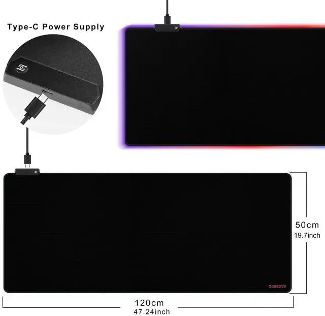 Upgrade your gaming station with the Large RGB Gaming Mouse Paddesigned for style, comfort, and top-tier performance. With 9 customizable RGB lighting modes, you can easily match your setups vibe. Switch modes with one press, or hold the button for 3 seconds to turn lights on/off. The smart memory function remembers your preference, so your pad lights up just the way you left it. Experience ample space with our XXL dimensions ( 47.2" x 19.7" ). This extended surface fits your full battle stationkeyboard, mouse, and even a notebookgiving you freedom and comfort during long sessions.