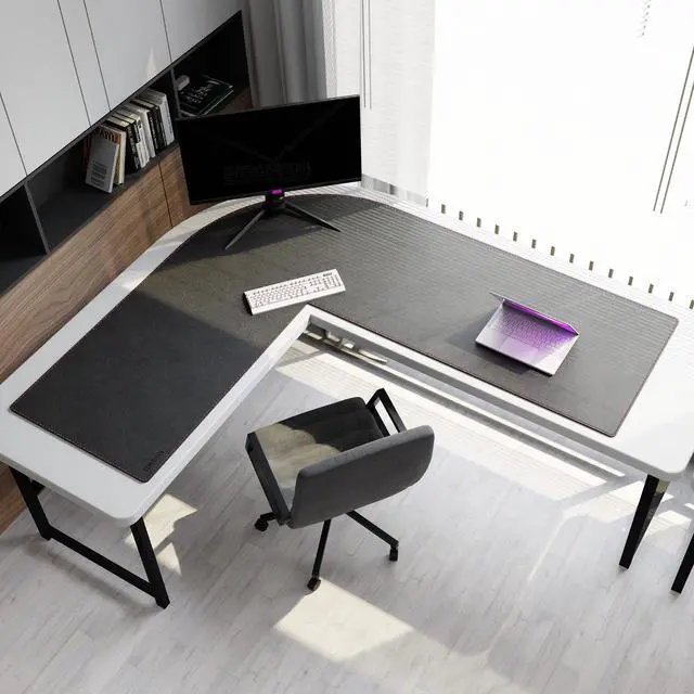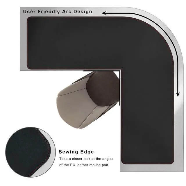 [PREMIUM L-SHAPE DESIGN] Cover large corner desks (72"+62")x 23.6" / (183+157)x60 CM) with our extra-large widen L-shaped desk pad, perfect for L-shaped workstations, and ample space for keyboard, mouse, and mutiple monitors. ^^ [Reversible Corner Desk Pad] Thick 2mm PU leather desk pad black with reinforced stitching. Flip between sleek matte and textured finishes to match your workspace aesthetic. Eensure long-lasting use as a l-shaped desk pad protector mat. ^^ [SMOOTH SURFACE] The ultra-smooth PU leather texture ensures consistent mouse tracking and effortless gliding for both office tasks and creative work.