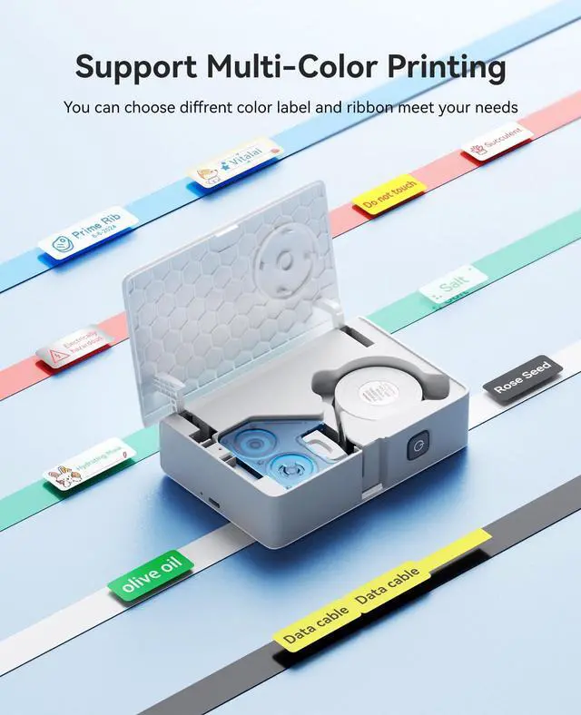 Color Printing Labels Maker: Niimbot N1 thermal transfer label maker support 5 colors of ribbon and various label paper you can choose. Ideal for price tags, barcodes, food dates, cables, files & more. Come with 1roll label tape 14*50mm and 1 roll black ribbon inside the label maker machine ^^ Label no
