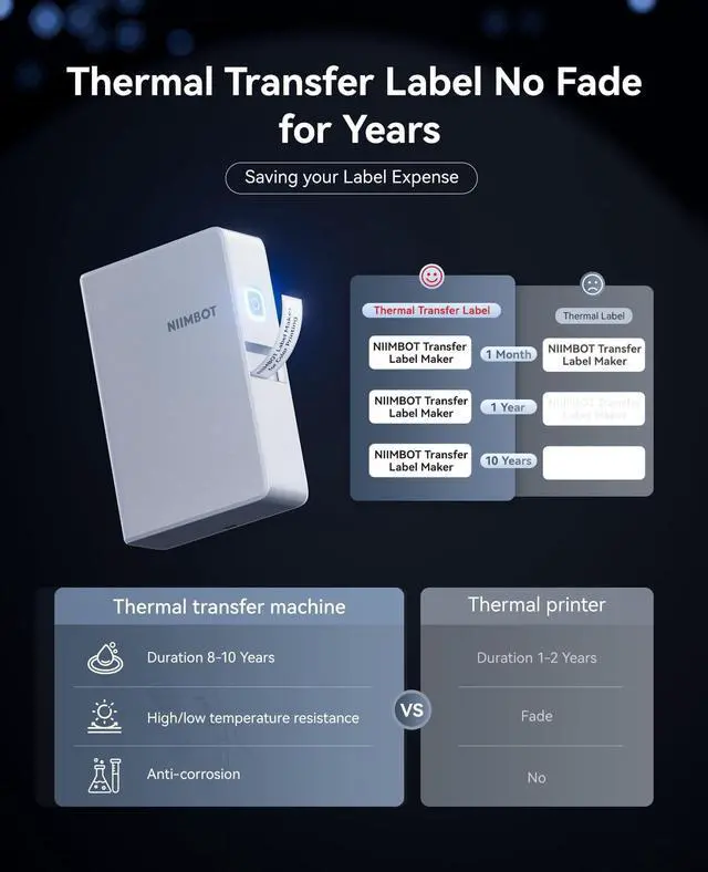 Fade: NIIMBOT N1 bluetooth label printer adopts thermal transfer upgrade technology. Support 0.5 inch label width printing. Different with thermal printers, the labels that print with the B18 label maker machine can be stored longer for 8-10 years, not only waterproof, oil-proof, and scratch-resistant, but also chemical resistance, can withstand high and low temperatures (-4F-248F), solving the limitation of short storage time of thermal labels ^^ Easy to