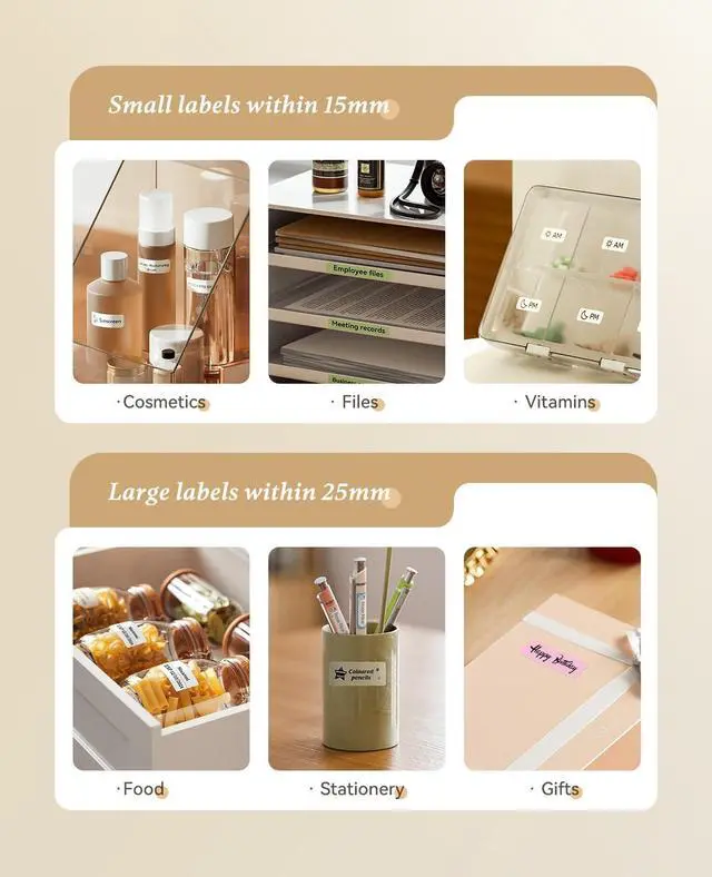 Upgraded Printing Width: adopted detachable paper bin design, which is compatible with all the consumable sizes of half-inch label maker machines. Users can also remove the baffle to expand the width according to their own needs, and print labels with a maximum width of 25mm, flexible and convenient ^^