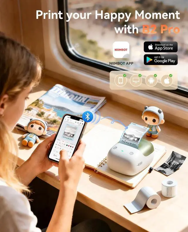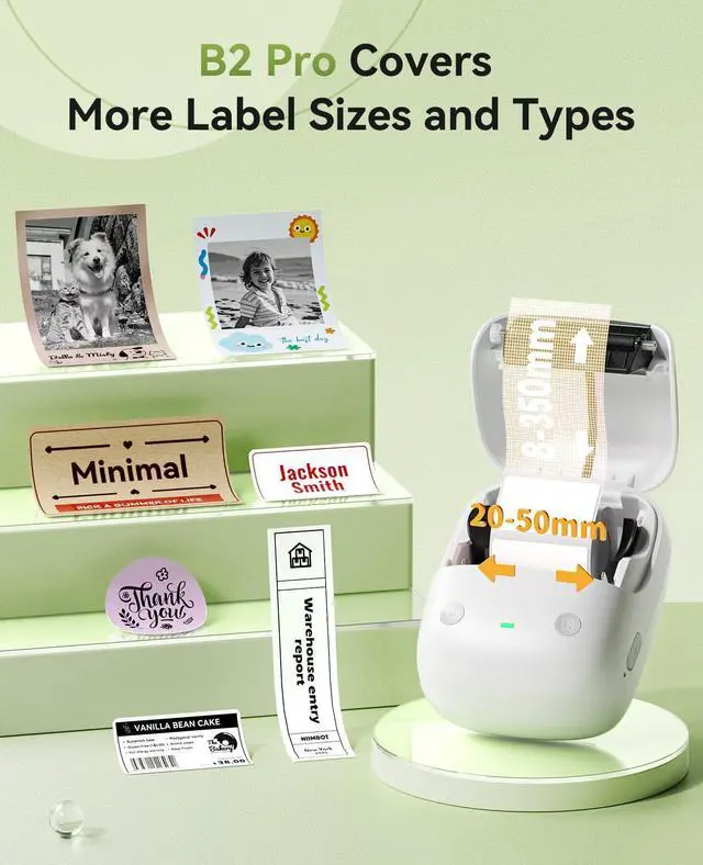 It offers 3 user-friendly modes: Real-time timestamp printingPrint last oneCustom template printing. Simply pre-set your preferred mode, and you can start printing instantly. ^^ Cover More Label Sizes & Type This B2 PRO label printer supports a print width range of 0.78 '' - 1.96 '' (20 - 50mm) and a print length range of 0.3 '' - 13'' (8 - 350mm). It is compatible with multiple paper types, including standard thermal label paper, photo paper, and two-color (red & black) thermal label paper ^^ Multi-Device Compatible & Fully CustomizableNIIMBOT B2 PRO Bluetooth label maker works with iOS/Android & PC (PC needs official driver; no Pad support); the NIIMBOT app has 10+ fonts/languages, 100+ borders, 1500+ symbols, barcodes, QRs & supports timestamp, photo, OCR printcustom and print labels anywhere with this handheld maker via simple app connection ^^ Compact & Durable Label MakerMade of rremium material with a smooth finish. Stylish and visually appealing. Perfect for study notes, decorating journals, crafting DIY cards, or capturing memories photosprecision tasks like marking medicine bottles, expiration dates, or highlighting important reminders with crisp clarity. Also good choice for small businesses, offices, schools, retail stores, jewelry tags, and home organization ^^ Update for firmwareWhen facing Bluetooth connection issues with Android phones, upgrade the printer's Bluetooth firmware via iOS or PC cloud printing.
