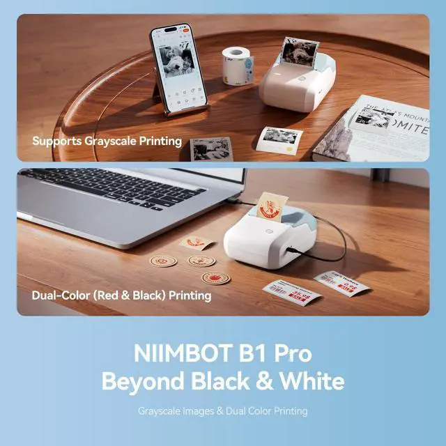 New Upgrades HD Label MachineNIIMBOT B1 Pro bluetooth label maker newly upgraded printing clarity--300DPI. It can print smaller fonts more clearly ^^ NOTEBuilt-in 2 x 1.2 -inch (50 x 30 mm) label roll, compatible with most NIIMBOT label printers. Other label paper models compatible with B1 PRO (shown in image) sold separately, for display only ^^ Picture & RedBlack Color PrintingB1 PRO Label Printer supports grayscale image printing and red&black dual-color label printing.