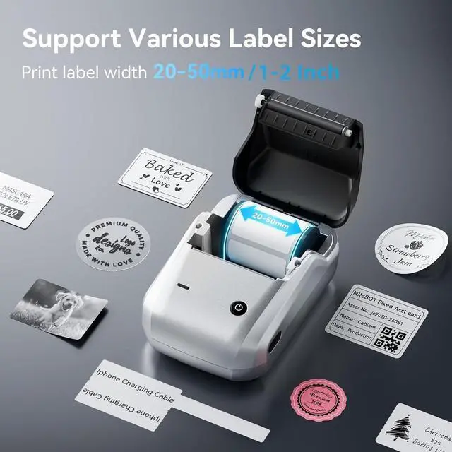 2 Inch Label MakerNIIMBOT B1 label maker machine's label width range of is 20mm-50mm(1-2 inch). NIIMBOT B1 label printer come with one roll label tape, 2x 1.18 inch (50x30 mm). ^^ Save Money & TimeWith the automatic label identification, NIIMBOT B1 bluetooth label printer makes your printing more fast and easier. It is thermal printer, no-need ink or toner, save money. To save energy, the label maker will auto-turn off after 15-minute pause. And you could also set the auto power-off (15min, 30min, 60min, never) to meet your needs.