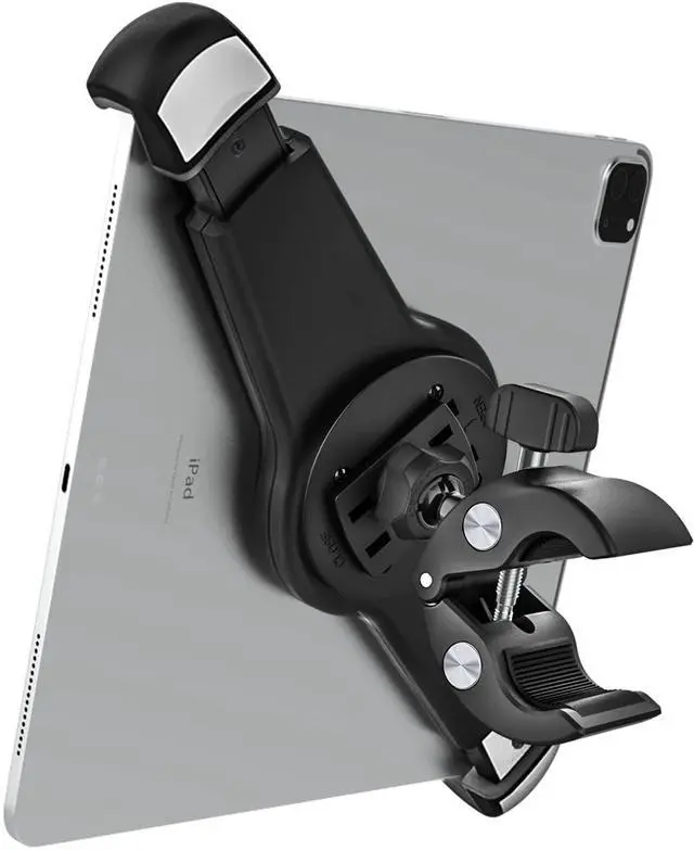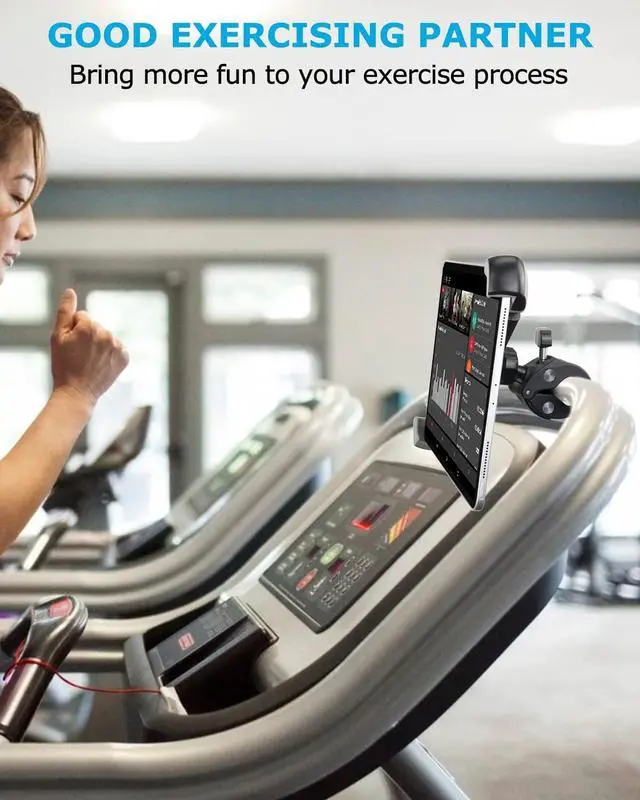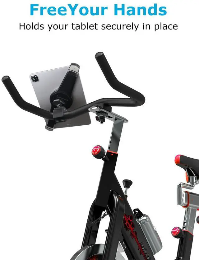 [(Easy to Mount & Position)] This iPad holder bike handlebar mount can be easily and securely clamped onto any tubular pole in your workout area with range of 0.55"-1.5" / 14-38mm in diameter, not only work well with spin bike, treadmill, elliptical, stationary bicycle or other fitness equipment with handlebar for indoor exercising; but also work well with microphone music stand, tube tripod stand, stroller, shopping cart.